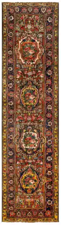 Persien. Um 1920-1930. Wolle auf Wolle. Im hellroten Innenfeld vier große Kartuschenmotive mit üppigem Blütendekor sowie korrespondierende Musterung. Umlaufend dunkelgrundige Bordüre aus stilisierten Palmettenranken. 407 cm x 107 cm.