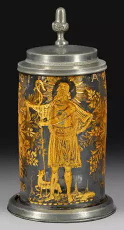 Dickwandiges, farbloses Glas mit vergoldetem Schnittdekor und Zinnmontierung. Walzenförmiger Korpus mit angesetztem Ohrenhenkel. Auf der Wandung Darstellung einer wandernen Apostelfigur, wohl den heiligen Jakobus darstellend, zwischen seitlichen großen floralen Gebinden. Ges.-H. 19,2 cm.
