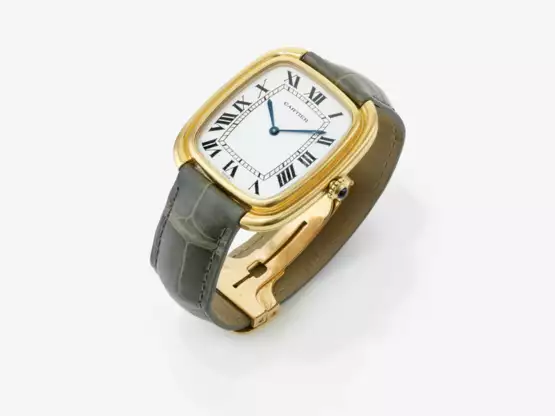 Weißes Zifferblatt mit schwarzen römischen Ziffern, blaue Lanzettzeiger. Rückseitig bezeichnet 18K Swiss, Cartier, Paris, 970500593. Originales grünes Lederarmband mit Schließe.
