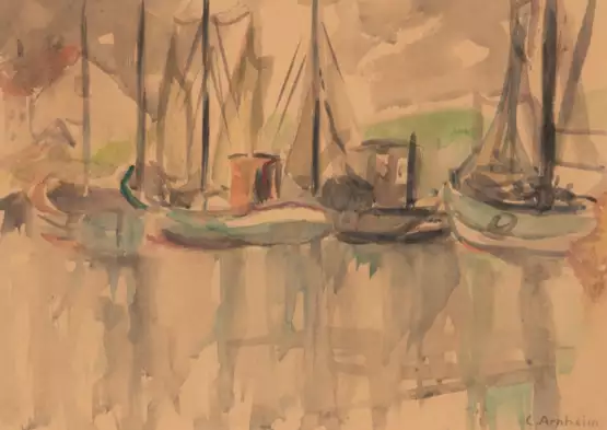 Lot 111 | Arnheim, Clara (1870 Berlin-1943 Theresienstadt) "Schiffe im Hafen", Aquarell, sign. u.r., 28,5x38 cm, im Passepartout hinter Glas und Rahmen (Malerin und Schriftführerin im "Verein Berliner Künstlerinnen&…