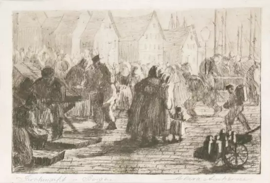 Lot 278 | Arnheim, Clara (1870 Berlin-1943 Theresienstadt) "Fischmarkt in Bergen", Radierung, signiert u.r., betitelt u.l., 10x14,5 cm, im Passepartout (Malerin und Schriftführerin im "Verein Berliner Künstlerinnen…