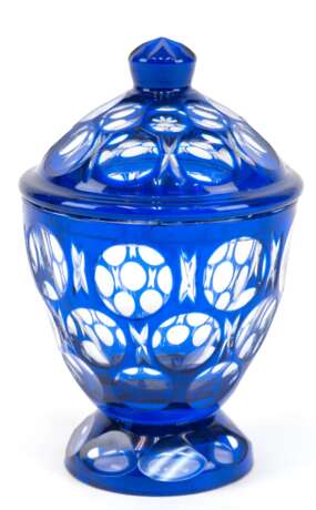 Lot 693 | Art-Deco-Deckeldose, Haida, farbloses Glas mit blauem Überfang, Ornamentschliff, H. 17 cm, Dm. 10,5 cm