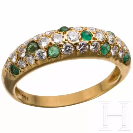 18ct Gelbgold. Besetzt mit 8 Smaragd-Cabochons und 29 Diamanten (zusammen ca. 0,58ct). Innen punziert mit Feingehalt "750". Zwei Steine mit Kratzern. Ringgröße: 57, Gesamtgewicht: 4 g.