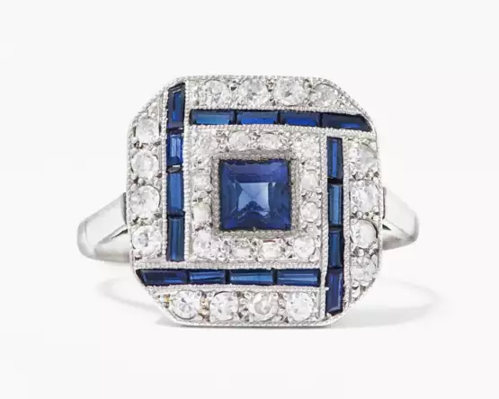 Um 1925. Platin/Weissgold. Oktagonaler Ringkopf mit Millegriffes-Bordüre. Im Zentrum ein Saphir-Carré von ca. 4 mm im Zentrum, umgeben von kleinen Altschliff-Diamanten und Saphir-Baguetten in Linien gefasst. Gr. 53, 3 g.