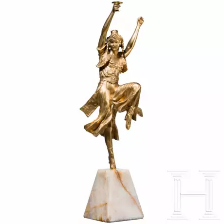 Bronze, feuervergoldet. Auf einem trapezförmigen Steinsockel montierte, im Stil des Art Deco gekleidete Tänzerin. Sie steht auf einem Bein und hält eine bewegliche Fußschale in die Höhe. Unsigniert. Kanten des Steinsockels bestoßen. Höhe Figur 30 cm, Gesamthöhe 39 cm.