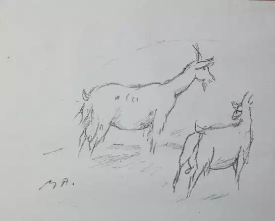 Zwei Ziegen, Sitzender Affe, Stehendes Pferd, Stehender Bauernbub, Auf einen Stab gestützt stehende Bäuerin, Sitzende, knapp decolletierte junge Frau.