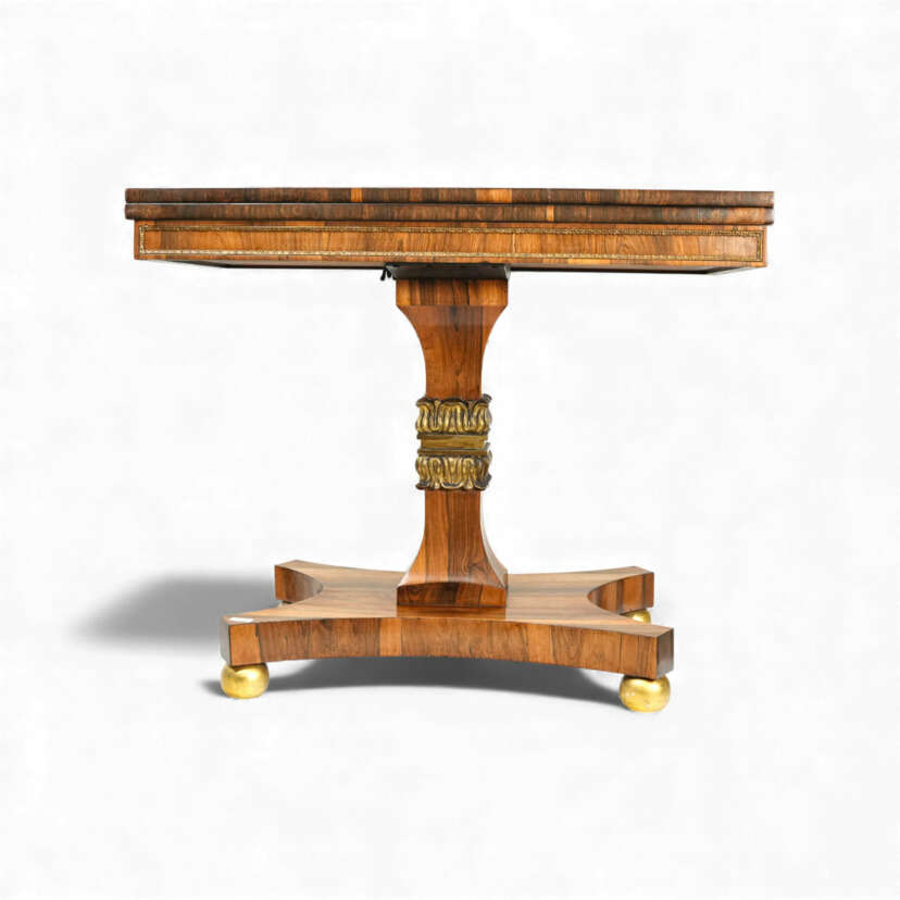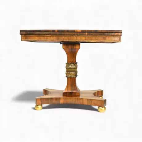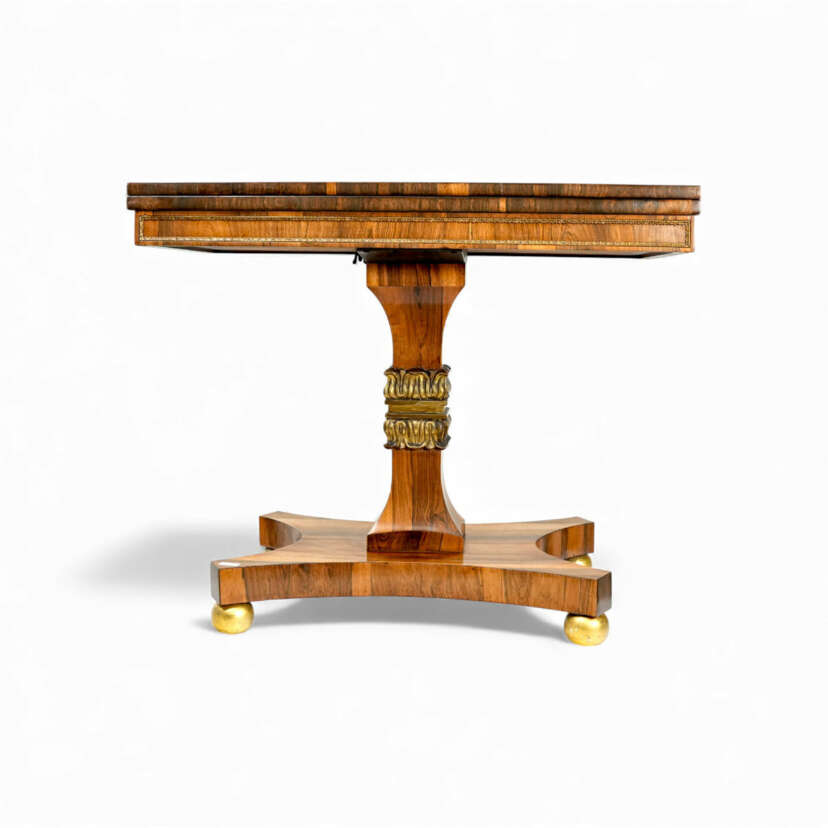 19th/20th century, hinged and swivelling table top with floral and rocaille-shaped brass inlays, including compartment for games, table box and column decorated with gold-painted ornaments, slightly pressed ball feet also painted gold, mahogany, rosewood veneer, table top with green felt overlay, 77 cm x 92 cm x 46 cm, game top 92 cm x 91 cm, slight signs of wear, brass rail detached in one place, ball feet slightly bumped in places