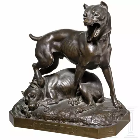 Bronze mit dunkelbrauner Patina, die Plinthe signiert "Lalouette". Ein aggressiv triumphierender Rüde über einer liegenden Hündin mit Preismedaille. Das Halsband des Rüden mit den Initialen "AL" der Vornamen Lalouettes. Der achteckige Sockel betitelt "Marriage forcé". Höhe 24 cm.