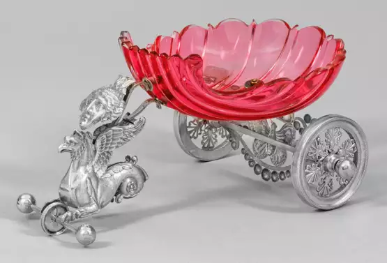 in Form eines Wagens. Silber und rosafarbenes Glas. Muschelförmige Glasschale montiert auf einer durchbrochen gearbeiteten Hinterachse mit perlförmigem Knospendekor und reliefierter Schmetterlingsdarstellung. Seitlich zwei bewegliche Räder mit blattförmig durchbrochenen Speichen. Die Vorderachse mit mittig kleinem beweglichem Rad, gehalten von einem plastisch gearbeitetem Greifen unter reliefplastischem, antikisiertem Frauenkopf. Minim. besch.; Gest., undeutl. Beschau- und Meisterzeichen. H. 11,7 cm. 23 cm x 16,5 cm.