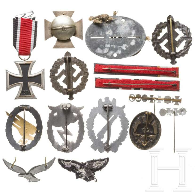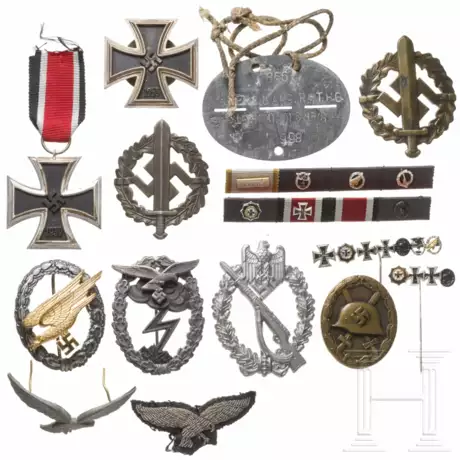 Erdkampfabzeichen (Feinzink), ISA in Silber (L/56), zwei SA-Sportabzeichen in Bronze und VWA in Schwarz. Dazu Erkennungsmarke "8./Ers. u. Aus. Rgt. H.G.", zwei beschädigte Mützenadler, Repro eines Widmungsfotos, Miniaturnadel und -spangen in der 1957er Ausführung.