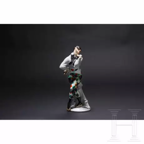 Porzellan, farbig bemalt, auf rundem Sockel. An einen verhüllten Pfeiler lehnende Tänzerfigur, gekleidet in einen Anzug mit farbiger Rautenmusterung und weißer Jacke. Um den Hals trägt er eine große schwarze Schleife, seine Augen sind durch eine Maske verdeckt. Er hält eine Peitsche in seiner Rechten. Pfeiler bez. "Scheurich". Unterseite mit blauer Schwertermarke 1. Wahl, Modellnr. "73309" und "182K". Höhe 27 cm. Vgl. Bergmann Bd. 1, Nr. 1017. Eine von fünf Figuren aus der Reihe des russischen Balletts "Karneval".