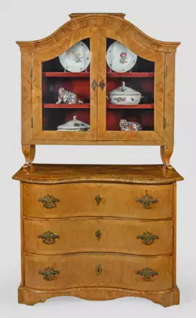 Nussbaum, furniert. Gerader, querrechteckig angelegter Korpus auf gesägtem Zargensockel. In der gegliederten Front drei doppelt geschweift Schubladen. Gering überstehende Deckplatte. Zurückgesetzter, zweitüriger Vitrinenaufsatz mit geschweifte ansteigendem Gesims auf geschweiften Streben. H. 173 cm. 102 cm x 59 cm.
