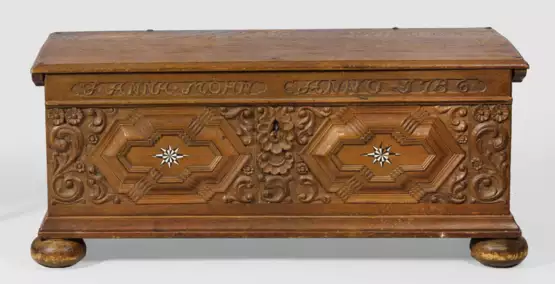 Eichenholz, teilw. geschnitzt. Gerader, querrechteckig angelegter Korpus auf profilierter Zarge und schauseitig, gedrückten Füßen. In der gegliederten Front zwei große Bastionfüllungen mit Faltsternen aus Knochen, umgeben von reliefierten Volutenmotiven. Oberhalb bez. F. Anna Möhn Anno 1786. Gering überstehender Flachdeckel. Innen sog. Hohe Kante. H. 54 cm. 127 cm x 52 cm.