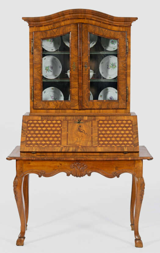 Nussbaum, furniert sowie Einlagen aus unterschiedlichen Hölzern. Passig geschweifte Zarge auf geschwungenen Beinen. Weit überstehende Deckplatte als Stütze für schräggestellte, abklappbare Arbeitsfläche mit Vogelintarsie. Dahinter gestaffelte Facheinteilung mit Geheimfächern. Oberhalb zweitüriger Vitrinenaufsatz mit geschweift ansteigendem Gesims. Flächendeckende Furnierfelder, teilw. aus Würfelmarketerie, von Bandeinlagen begrenzt. H. 199 cm. 121 cm x 63 cm.