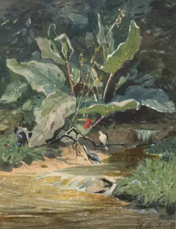 Lot 16 | Bartels, Hans von (1856 Hamburg-1913 München) "Vogel auf Ast am Ufer sitzend", Gouache, sign. u.r. und dat. ´77, 15x11,5 cm im Passepartout hinter Glas und Rahmen (Landschafts- und Figurenmaler, Schüler von R. …