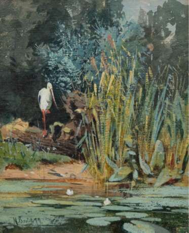 Bartels, Hans von (1856 Hamburg-1913 München) "Storch am Weiher stehend", Gouache, sign. u.l. und dat. ´78, 15x11,5 cm, im Passepartout hinter Glas und Rahmen (Landschafts- und Figurenmaler, Schüler von R. Hard…