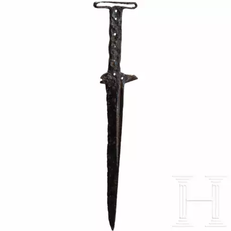 Kräftige Rückenklinge mit beidseitiger schmaler Kehlung. Integral geschmiedete Parierstange, ein Ende unvollständig. Einseitig gekehlte Angel mit Resten der Griffnieten aus Messing, flacher, hohl gearbeiteter Knauf. Länge 35,5 cm.