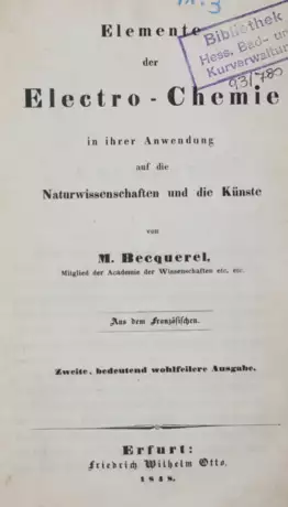Seltene zweite dt. Ausgabe von "Elements d'electrochimie appliquee aux sciences naturelles et aux arts" (Paris 1843); die erste dt. Ausgabe ersch. 1845. - St.a.T.u.V.