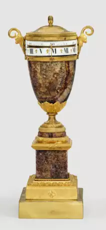 In unterschiedlichen Violett-, Beige- und Gelbtönen, sog. "Blue John" Fluorit und feuervergoldete Bronze. Über gestuft ansteigendem Sockel mit umlaufendem Fries aus Palmetten und Perlstab balusterförmiger, sich konisch weitender Korpus, seitlich mit kleinen Henkeln aus Löwenmaskarons und Voluten. Flach ansteigender Deckel mit Bekrönung in Form einer stilisierten Eichel. In der Vase eingesetzte, drehbare Ziffernringe aus Email mit römischen und arabischen Zahlen, vergoldeten Bourbonen-Lilie und Pfeilanzeiger. Altersbedingte Spannungsrisse. H. 31 cm.