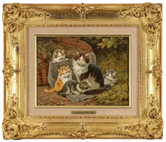 Auf einer Decke tollen vier Katzenjunge um eine größere Katze herum. Typisches Werk des "Katzen-Kögl" genannten Tiermalers mit possierlicher Katzengruppe in hoher realistischer Auffassung. In der Nachfolge des Münchener Malers Julius Adam, der sich ebenfalls vornehmlich mit Katzenmotiven befasste, hatte Kögl mit seinen teils rührenden, teils neckischen und stets von fotografischer Naturtreue geprägten Bildern großen Erfolg. Öl/Holz. R. u. sign.; 18 cm x 24 cm. Rahmen.