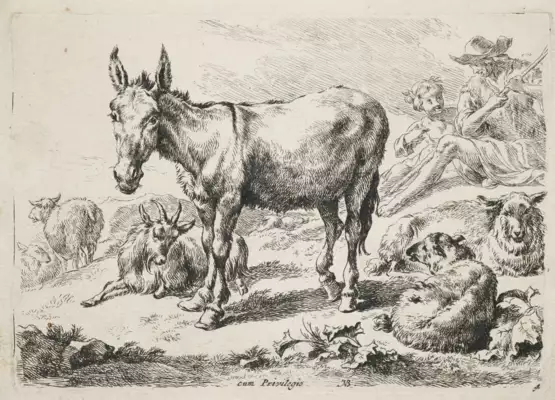 (1620 Haarlem - 1683 Amsterdam). Landschaft mit Esel, Schafen, Ziege und Hirten. Radierung, unten monogr. Ca. 11,8 x 16,5 cm.