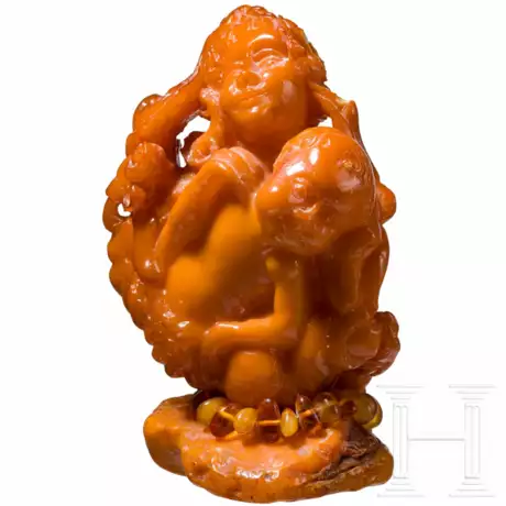 Bernstein, vollplastisch geschnitzt. Auf einem steinförmigen Bernsteinsockel. Sehr fein geschnitzte Darstellung einer Mutter mit ihrem Kind vor ihrer Brust. Detaillierte Ausführung der Haarpracht und naturalistische Gesichtszüge. Zwischen Sockel und Figurengruppe Bernsteinkette. Haarschmuck der Mutter an ihrer linken Kopfhälfte beschädigt. Maße 13 x 9 cm, Gewicht 244,93 g.