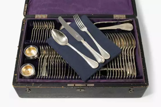 Silber, 129-teilig. Herstellermarke Jarosinki & Vaugoin. Bestand: 12 Tafellöffel, 12 -messer und 12 -gabeln, 12 Dessertlöffel, 12 -messer und 12 -gabeln, 12 Kuchengabeln, 12 Kaffeelöffel, 10 Mokkalöffel, 11 Servierbestecke und 2 Salièren. In originalem Kasten. Wiener Amtspunze, Herstellermarke, Feingehalt 800. Ca. 5470 g (ohne Messer).