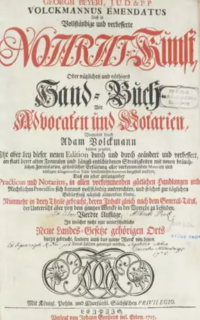 Harms, Notariat 109 (Anm.). Nickisch S. 58 u. Nr. 65. - Vierte Ausgabe der erstmals 1695 erschienenen Umarbeitung des "Volckmann" von dem Juristen Georg Beyer. Seit 1629 für mehr als 150 Jahre das maßgebliche Lehrwerk des Notars; ursprünglich verfaßt von dem brandenburgischen geheimen Rat A.Volckmann. - Vorliegende Ausgabe nach dem Tode Beyers erschienen. - Etw. ebräunt, gering fleckig, Drucktitel mit Besitzvermerken und, wie der gestoch. Titel, mit klösterlichem Besitzstempel, Ebd. etwas berieben, fleckig, Innengelenk gering aufgeplatzt bzw. mit Wurmspuren; insges. ordentliches Exemplar.