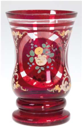 Lot 695 | Biedermeier-Becher, Böhmen, partiell rot lasiert, polychrome, florale Kaltmalerei, H. 12,5 cm