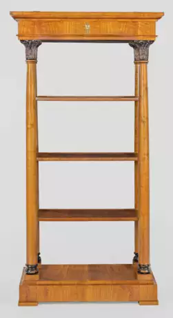 Kirschbaum, furniert. Gerader, rechteckiger Sockel auf flachen Scheibenfüßen. Oberhalb davon ausgehend konische Vollsäulen mit reliefierten Basen und Kapitellen als Träger für Ablageflächen. Korrespondierender Gesimsabschluss mit verdeckter Lade. H. 181 cm. 96 cm x 55 cm.