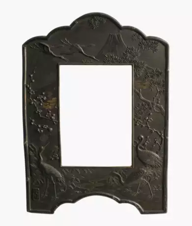 Japan, Meiji-Zeit. Bronze. Signiert Hiroyuki. Passige Form, der Rahmen wie ein Bambusrohr geformt. Der Rahmen im Relief verziert mit Kranichen unter Prunus- und Kieferbäumen an einem Fluss, im Hintergrund der Berg Fuji. 24x17 cm.