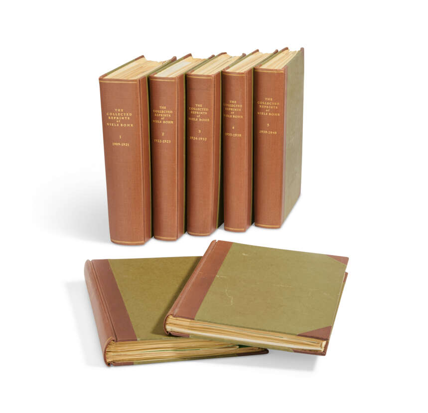 Together 172 works in 7 volumes, quarto (270 x 195mm), 39 of which in facsimile, all numbered either with small labels or in pencil, typescript titles, contents leaves and index at end of final volume. Modern library half cloth over boards (extremities a fraction rubbed). Provenance: Niels Bohr (the first 5 vols presented by his secretary Sophie Hellmann on his 70th birthday, with her compilation of 2 more volumes up to his death; thence by descent to:) – Aage Bohr (numbers 39, 40 and 41 contain his hand-written comments) – thence by descent.