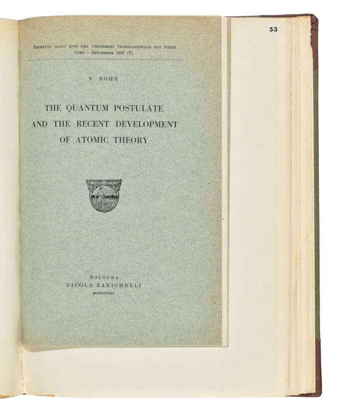 An exceptional collection comprising 172 offprints, including works by Bohr that laid the foundations for the understanding of atomic structure and quantum theory, for which he received the Nobel Prize in Physics in 1922.