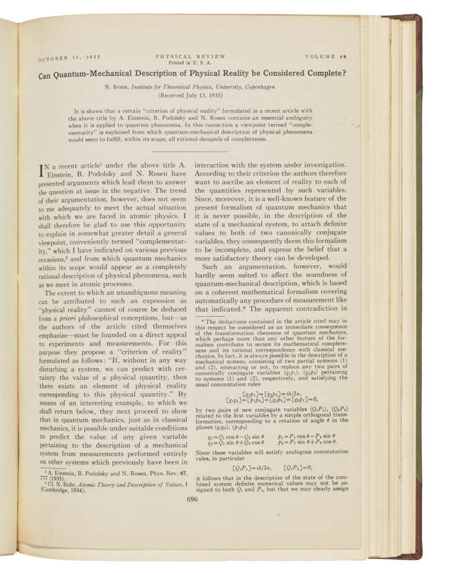 · Bohr's response to the 1935 EPR paper by Einstein, Podolsky, and Rosen, defending the completeness of quantum mechanics while articulating that quantum phenomena require a new conceptual framework distinct from classical ideas: – ‘Can quantum-mechanical description of physical reality be considered complete?’ Offprint from: Physical Review. 48. Minneapolis: University of Minnesota, 1935. Pp. 696-702.
