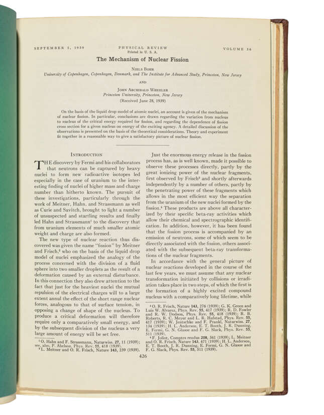 · The first fully worked-out theoretical explanation of nuclear fission, clarifying how the nucleus of uranium-235, when bombarded with neutrons, undergoes a deformation that leads to its splitting: – and John A. WHEELER. ‘The mechanism of nuclear fission.’ Offprint from: Physical Review. 56. Minneapolis: University of Minnesota, 1939. Pp. 426-450.