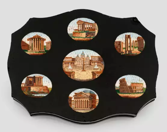 Schwarze, passig geschweifte Schieferplatte. In ovalen Medaillons 7 feine und detailgetreu gearbeitete Sehenswürdigkeiten aus Rom. Zentral Ansicht des Petersplatzes. Umlaufend die Darstellungen mit Forum Romanum, Kolosseum, Pantheon, Vesta-Tempel in Tivoli und Herkules-Tempel. H. 2 cm. 15 cm x 11,5 cm.