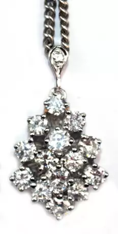 Lot 897 | Brillant-Anhänger an Kette, 585er WG, tropfenförmiger Anhänger ausgefasst mit 14 Brillanten von zus. ca. 1,5 ct., vsi, L. mit Öse 2,3 cm, Ketten-L. 42 cm, Ges.-Gew. 7,48 g