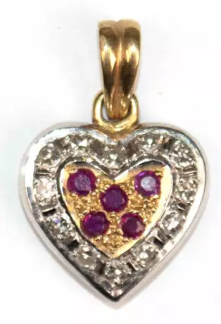Lot 902 | Brillant-Rubin-Herzanhänger, 750er GG/ WG, mit 12 Brillanten von zus. ca. 0,24 ct.,und 5 Rubinen ausgefasst, Ges.-Gew. 2,58 g, L. (mit Öse) 2,0 cm