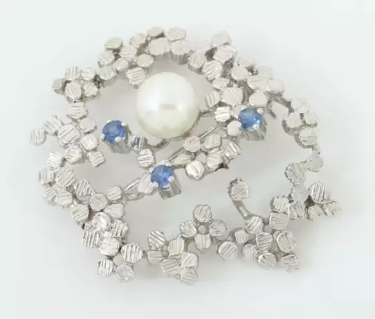 Lot 1273 | Brosche mit Perle Um 1970, Weißgold 585, punziert, ges. 7,9 g, besetzt…