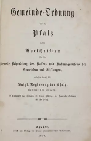 Engelmann, Bibl. geogr. 541. - Einzige Ausgabe der seltenen Beschreibung der vorderen Pfalz mit ausführlichem Ortsregister. Enthält die prachtvolle Panorama-Ansicht von Bergzabern bis Grünstadt (21 x 128,5 cm) mit Personenstaffage u. Eisenbahn, die wie auch die Karte nicht allen Exemplaren beigegeben wurde. - Stockfleckig. Exlibris. - ╔Dabei: Häusser,L.╗ Geschichte der rheinischen Pfalz... Bd. 1. Hdbg. 1845. - ╔Geib,K.╗ Reise-Handbuch durch alle Theile der Königl. Bayerischen Pfalz in localer und historischer Beziehung... Zweibrücken 1841. Ohne die 2 Karten. - ╔Höfler,K.A.K.╗ Ruprecht von der Pfalz... 1400-1410. Fbg. 1861. - ╔Mehlis,C.╗ Fahrten durch die Pfalz. Augsburg 1877. Mit 1 Karte u. Verf.-Widm. - ╔Gemeindeordnung╗ für die Pfalz... Speyer 1869. - - ╔Generelle╗ Weisungen der hoehern Behoerden 1865-1866. (Rückentitel). Sammlung von Urkunden, Bescheiden und Vorschriften vorwiegend des Königl. Bayerischen General-Staats-Prokurator am kgl. Appellationsgerichte der Pfalz in Zweibrücken, dat. zwischen dem 13. Februar 1865 und 12. Dezember 1866. Fol. 123 Bl., meist handschriftl. auf tls. gedruckten Formularen, tls. hektografiert. Läd. Hldr. d. Zt. (Rckn. mit Fehlst., berieben u. bestoßen). -Tls. Rand angestaubt, knickfalt. u. stellenw. etw. rissig, 1 Bl. lose. - Zus. 7 Bde.