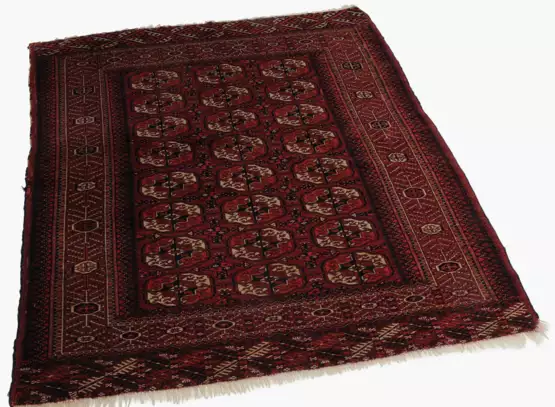 Turkmenistan, um 1900. Auf braun-rotem Grund liegen 3 Hauptreihen mit je 8 Tekke-Buchara-Göls, begleitet von 2 Reihen mit sekundären Göls, dazu eine Hauptbordüre, die mit charakteristischen Buchara-Zeichnungen besetzt ist. Die Endungen und Seiten müssen befestigt werden, ansonsten gute Erhaltung. 117x143 cm (ft. 3.9x4.7).