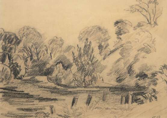 Lot 21 | Büchsel, Elisabeth (1867-1957 Stralsund) "Boddenlandschaft", Zeichnung, monogr. u.r., 20,5x28,5 cm, im Passepartout hinter Glas und Rahmen (Nach künstlerischer Ausbildung unter anderem in Berlin und Paris lebte…