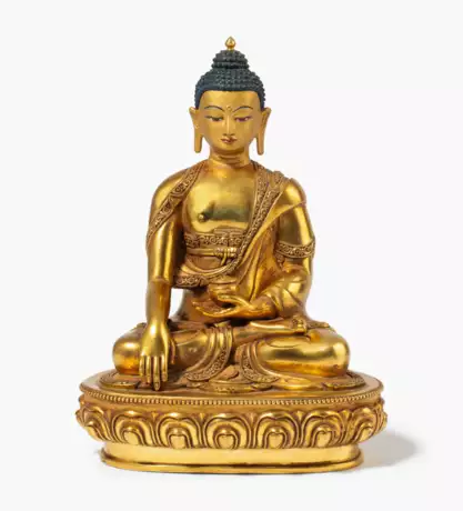 Tibet/Nepal, 20.Jh. Kupfer feuervergoldet, Details kaltbemalt. Der historische Buddha sitzt in dhyanasana auf einem Lotussockel. Seine Rechte zeigt das bhumispharsa-Mudra, die Linke liegt in dhyana-Mudra über seinem Schoss und umfasst eine Almosenschale. H 21,5 cm.