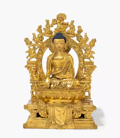Nepal, 20.Jh. Kupfer, feuervergoldet, mit kaltbemalten Details. Der historische Buddha sitzt in dhyanasana auf einem Lotussockel über einem separaten, rechteckigen Podest und ist von einer abnehmbaren Aureole umgeben. Seine Rechte zeigt das bhumispharsa-Mudra, die Linke liegt in dhyana-Mudra über seinem Schoss. H 28 cm.