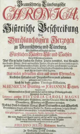 Loewe 501 (unter Rehtmeier). Wegele 722 f. Graesse I, 572. - Stark erweiterte Neuauflage der zuerst 1584 erschienenen berühmten Städtechronik und Landesgeschichte. Das Hauptwerk des aus Hannover stammenden evangelischen Historikers Bünting (1545-1606) wurde von Rehtmeier bis zum Beginn des 18. Jh. fortgesetzt, erweitert zu einer allgemeinen Geschichte des Welfenhauses. Die Tafeln mit zahlreichen Medaillen und Münzen, die Textholzschnitte mit Wappen und Siegeln. - Gebräunt u. fleckig, tls. wasserrandig, S. 1595-1598 hs. ergänzt.