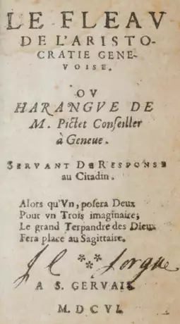 Dufour S. 80. Laroche, BBA XXI Nr. 12. - Im Jahr 1605 verfasste Marc-Antoine de Buttet, Anwalt im Senat und Historiograf des Herzogtums Savoyen, eine Streitschrift für den Herzog mit dem Titel Le Cavalier de Savoie. Im folgenden Jahr widerlegte Jean Sarrasin, Syndikus von Genf, dieses Werk mit Le Citadin, ou response au Cavalier de Savoye. Zwei Monate später erschien Le Fleau de l'aristocratie genevoise als Antwort auf Sarrasin. Der Autor vermutet, daß diese Rede von Pictet vor dem Großen Rat von Genf gehalten wurde, was von Historikern bestritten wird. Unter den einleitenden Dokumenten fällt eine Mitteilung des Druckers an den Leser auf, die eine Satire auf Le Citadin enthält. Diese polemische Streitschrift enthält mehrere für die Geschichte Genfs wertvolle Dokumente, darunter die genaue Liste der Vidamen dieser Stadt von 1267 bis 1535. - Vors. mit Namenszug "L.A. Necker". - Fleckig u. etw. gebräunt, N.a.T.