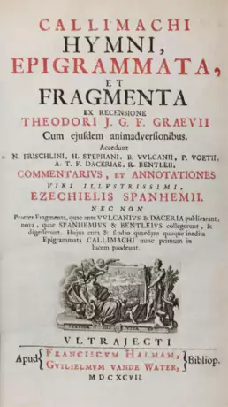 Hoffmann, I, 429. Graesse, II, 17-18. Dibdin, I, 368-9. Erste Ausgabe mit den "Fragmenta" gesammelt von dem englischen Gelehrten Richard Bentley (1662-1743) und einem gelehrten Kommentar von Spanheim. - Innendeckel mit Exlibris, etw. gebräunt, Ebd. etw. fleckig, insges. gutes Exemplar.