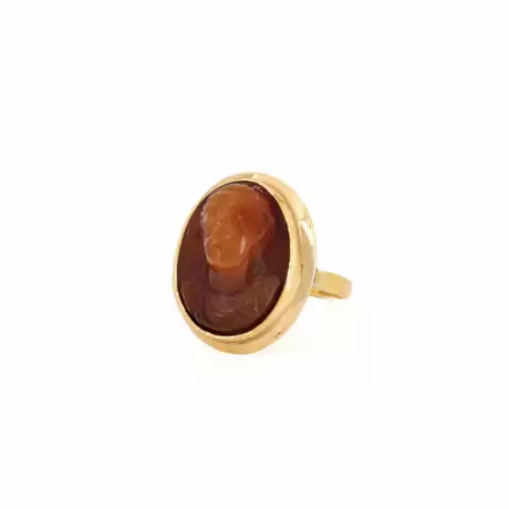 Description: Yellow gold ring with cameo in beveled prong setting, depiction of a profile of a young