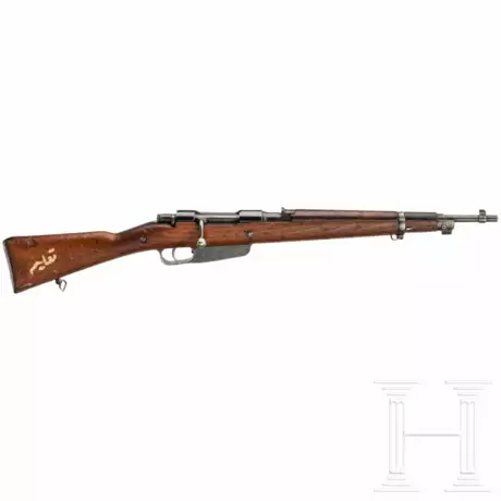 Cal. 8x57JS, SN. RB289, nummerngleich. Dt. Beschuss. Hülsenkopf ohne Beschriftung. Laufwurzel gemarkt "FNA-B". Kaliber auf dem Visiersockel. Originale Brünierung fleckig, partiell flugrostig. Verschluss grau. Nummerngleicher Buchenschaft. Putzstock fehlt. Durch behutsame Reinigung zu verbessern. Länge 92 cm.