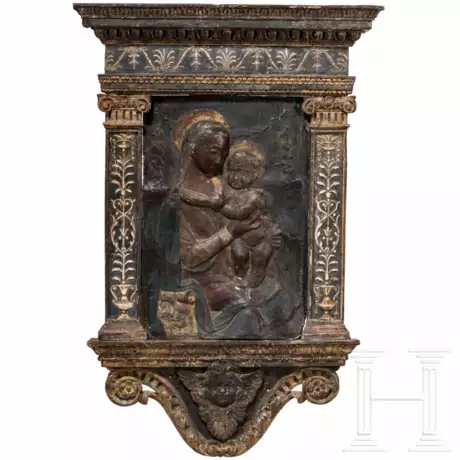 Aus Pappmaché geformtes Basrelief mit Darstellung einer thronenden Madonna mit Kind. Voller Unschuld und Anmut wendet sich die Mutter dem kleinen Christus zu, der sie umarmend an ihrem Kleid festhält. Die in Resten vergoldete Mangette sowie die Ausschnittpartie Mariä leicht punziert. Im prachtvoll verzierten und bunt bemalten Renaissance-Rahmen mit stark profiliertem Gesims. Die originale Farbfassung berieben, insgesamt etwas wurmstichig. Maße ca. 66 x 44 cm.